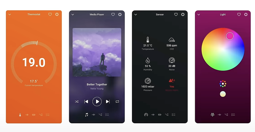 스마트폰 앱으로 온도조절도 되고, 집안 온도/습도/소음 데시벨 등 수치도 볼 수 있고, 조명 색이나 밝기도 조절되네요.